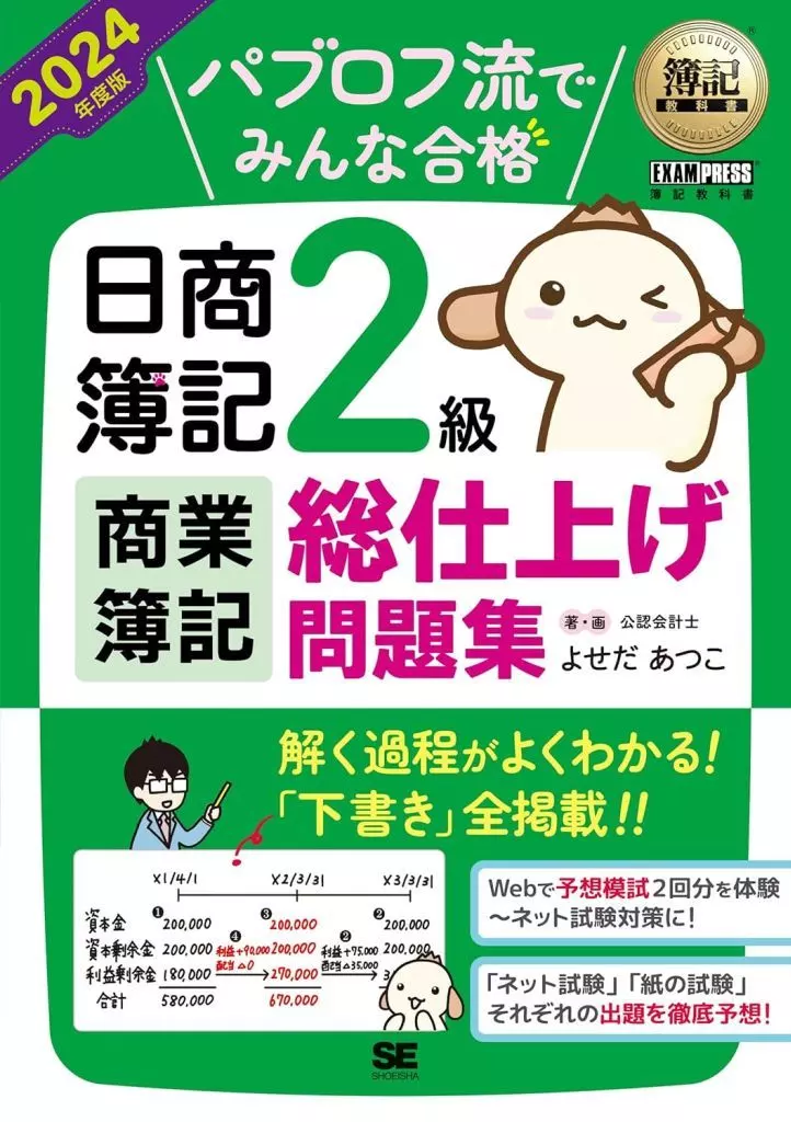 簿記教科書/紙の試験><ネット試験>それぞれの出題を徹底予想!!自宅でしっかり練習できる「ネット試験(予想模試)」の特典つき【改訂内容(1)】過去60回分の本試験と最近の試験の傾向を分析し、問題の変更などをおこないました!【改訂内容(2)】紙の試験・ネット試験、それぞれの出題を予想しました!掲載している全問題を【よく出る・ときどき出る・あまり出ない】の3段階に分類。★ネット試験では、標準的な出題が多いので「よく出る」と「ときどき出る」をマスターするのが効率的!★紙の試験では、見慣れない問題が出ることもあるので「あまり出ない」にも目を通しておくと安心です!【省略しているところがない、詳しい解説!】本書の解説では、問題の内容を理論的に説明したうえで、「下書き」を全問掲載しています。問題を解くとき「自分でどのように手を動かせばいいか」を明確にしている点が最大の特徴です。ミスなく効率的に問題を解いている人がどのような 「下書き」を書いているのかが学べます。同じ「下書き」を書くことができるようになれば合格がグッと近づきます!【ネット試験(予想模試)をスマホやPCで体験できる】●操作感が本番の試験によく似ていると大好評!●時間、問題数、タイマー機能など本試験と同じ●採点のほか、解答と解説が表示され復習もできる(本試験では合否のみの表示)【こんな人にオススメ】●テキストを読み終わり、試験レベルの問題を解きたい●ネット試験・紙の試験、それぞれに合った勉強方法で学習したい●分野別に、集中的に学習したい●講師や合格者の効率的な解き方を知りたい【本書の特徴】●過去60回分の本試験を分析した問題集! 出題される可能性の高いパターンを網羅してあります。●基礎から丁寧に解説!~多くの質問に答えている著者ならではの視点が凝縮! 誰でも再現できる解き方が書いてあります。●本書を使った効率的な学習法や合格の仕方の動画解説は、「YouTube パブロフ 使い方動画」等で検索してください。【著者に質問ができる安心感!】著者のブログでは、本書に関する内容の質問を受け付けています。著者がやさしく回答しますので、独学でも安心です!
