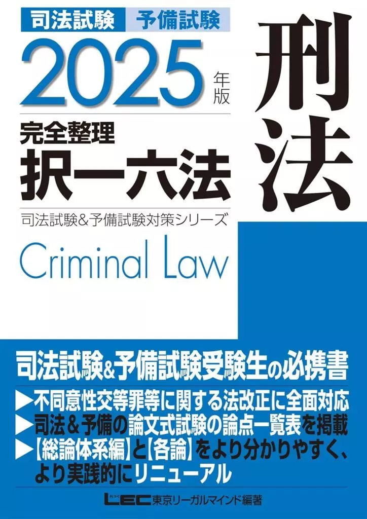 司法試験・司法試験予備試験の短答式および論文式試験に必要な条文・判例・過去問知識の情報を、図表・判例索引などを用いて見やすく整理し、効率的な学習を可能としました。重要基本論点のポイント解説や全体構造の把握を盛り込み、全体的に大胆なメリハリを付けています。★最新法改正対応令和7年1月までに施行予定の改正法に対応(=2025年合格目標)★必要十分な知識・判例を掲載刑法の出題の多くは、具体的事例における学説からの帰結・あてはめや判例の立場からの結論を問うものです。そのため、条文や判例、主要な学説を正確に理解し、適切にあてはめて結論を導く力が試されます。本書はこのような問題に対応するため、本文中に具体的事例や図表を多く盛り込み、複数の事案の違いが意識できるように工夫しています。盛り込んだ事例は、過去の出題履歴をベースにしており、狙われやすい具体例を効果的に学習できるようになっています。また、特に重要な判例に関する知識は、百選掲載判例及び重判掲載判例をビックアップし判旨を紹介しています。★司法試験短答式試験、予備試験短答式試験の過去問情報を網羅本書では、司法試験・予備試験の短答式試験において、共通問題で問われた知識に〔共〕マーク、予備試験単独で問われた知識に〔予〕マーク、司法試験単独で問われた知識に〔司〕マークを付しています。これにより知識の重要度がひと目で分かるようになっています。★最新判例インターネットフォロー短答式試験合格のためには、最新判例を常に意識しておくことが必要です。そこでLECでは、最新判例の情報を確実に収集できるよう、本書をご購入の皆様にインターネットで随時最新判例情報をご提供させていただきます。