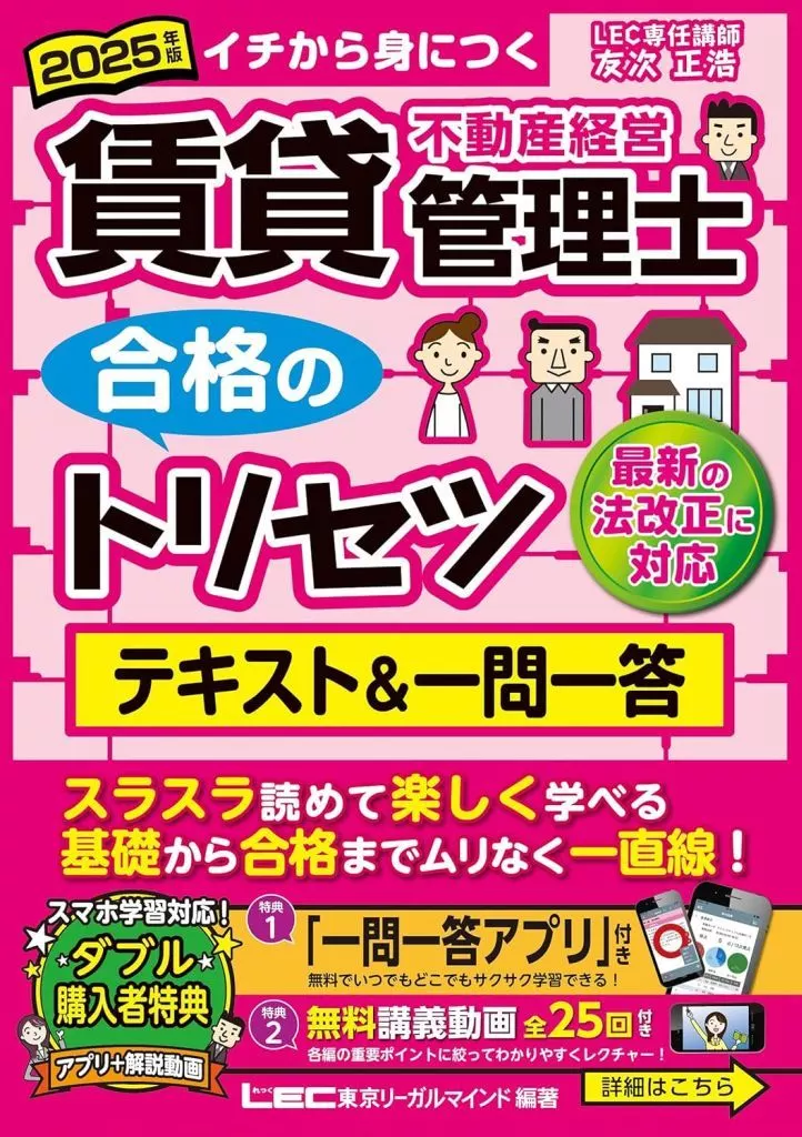 【賃貸不動産経営管理士】はLECにおまかせ!本格的なスマホ学習「一問一答アプリ」付き!NTTアドバンステクノロジ株式会社開発の本格学習アプリを採用。本書収録の一問一答の全問がスマートフォン、タブレット、PCなど様々なデバイスでいつでも演習できるので、学習進度と理解度が更に深まります!(アプリの利用開始日2025年6月1日/登録期限2025年11月15日/利用期限登録から6か月)『トリセツ』は、より学びやすく、より合格に近づけるような工夫をこらして作成しています。初学者・独学者もスラスラ読めてわかりやすい『トリセツ』で2025年度試験の合格を目指しましょう!---【購入者特典】全編無料講義動画 全25回本書の著者、友次正浩 LEC専任講師が、本書を使って重要ポイントを講義!講義の項目も著者自らセレクトし、受験生に伝えたい合格に必要なポイントが収められています。動画の内容は各編の重要ポイントに絞っているので手軽に学習できます!---【ココが POINT】・本試験をトコトン分析。最新の試験に合わせた編成で受験生の学習をサポート!・発刊後の最新情報も提供!新たに試験範囲になるであろう分野の情報は、専用サイトに掲載。発刊後も、新しい情報で安心して学習できるようサポートしますので、ぜひご確認ください!・初学者も安心!読みにくいと思われる語句にはふりがなをつけています。・出来る限り簡単な文章で執筆!専門的な言葉やわかりにくいと思われる語句は、用語集ページに言葉の意味を掲載しています。・出題実績から重要度を設定!効率的にインプットできます。・わかりやすい図解・イラストを掲載!イメージをつかみながら学習できます。・編ごとに一問一答を収録。力試しや学習の定着確認ができます。---【あわせて学習】過去問対策の学習には、同シリーズ『2025年版 賃貸不動産経営管理士 合格のトリセツ 過去問題集』をご利用いただくと学習効果が高まります。