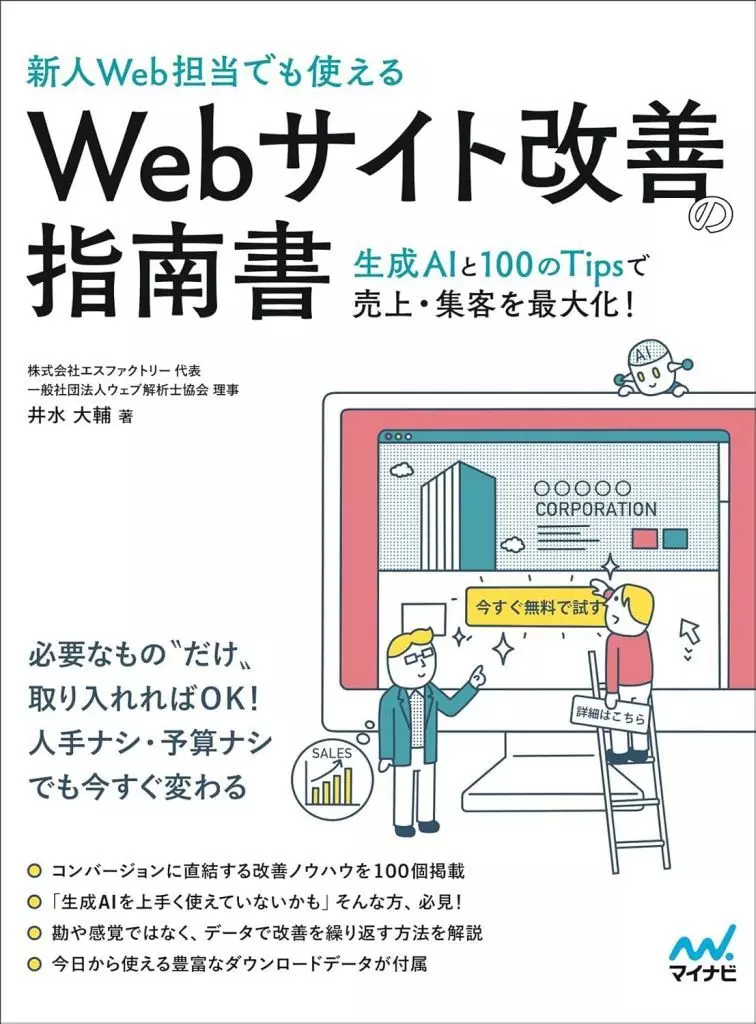 情報科学Webサイトの本来の目的であるコンバージョン(=最終的な成果。商品購入、来店、資料請求、体験申込など)アップにつながる改善Tipsを100個まとめて掲載します。ユーザビリティ(コンテンツやナビゲーションなどの最適化)を高める方法に焦点を当てることで、「Web開発に詳しくなくても改善ポイントがわかる」のがポイントです。