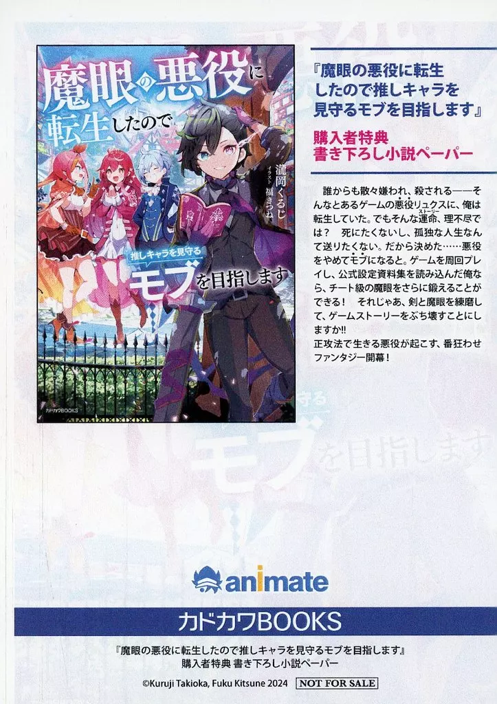 1枚仕様こちらの商品は、ライトノベル「魔眼の悪役に転生したので推しキャラを見守るモブを目指します(1)」のアニメイト購入特典になります※店頭配布の店舗特典ペーパーにつきましては、配布店舗のコピー機で印刷されたものについても同じ品番での扱いとさせていただいております。ご了承ください。