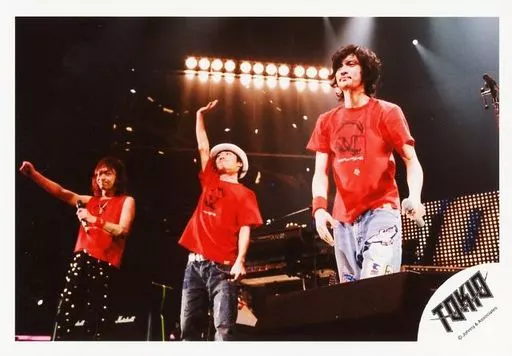 生写真(ジャニーズ)/アイドル/TOKIO TOKIO/城島茂・国分太一・長瀬智也/横型・ライブフォト・膝上・衣装赤.黒・左手マイク・国分.城島右手上げ/公式生写真