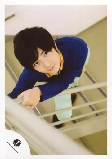 生写真(ジャニーズ)/アイドル/Classmate J Classmate J/髙橋優斗/全身・衣装青・黄色・チェック柄・左手手すり・顔傾げ・階段・背景白/ジャニーズJr.「ジャニーズ銀座2016」inシアタークリエ グッズ撮影オフショット/公式生写真