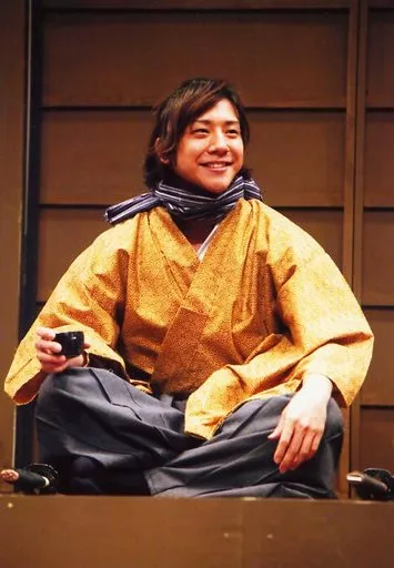 生写真(男性)/俳優 椎名鯛造(興吉)/ライブフォト・全身・あぐら・和服黄・右手お猪口・左手左膝・笑顔/舞台「SAMURAI挽歌 II 紀州の魂」