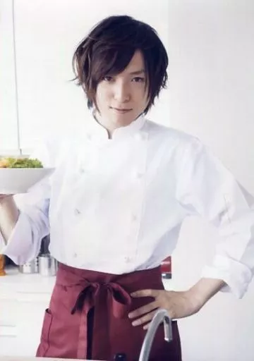 生写真(男性)/声優 蒼井翔太/膝上・衣装白・エプロン赤・左手腰・右手皿・口閉じ・キッチン・背景白/SUNBEAM Presents 「Cooking&Talk LIVE COOKING BOYS♯13」