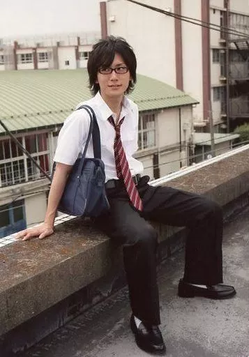生写真(男性)/俳優 横田和也/全身・衣装白黒・ネクタイ赤・制服・体右向き・目線左・眼鏡・屋上/DVD「横田和也」特典生写真