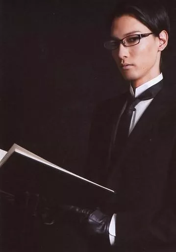 生写真(男性)/俳優 永岡卓也(ウィリアム・T・スピアーズ)/上半身・衣装黒・白・スーツ・左向き・両手本・背景黒・キャラクターショット/ミュージカル「黒執事 The Most Beautiful DEATH in The World 千の魂と堕ちた死神」ブロマイド