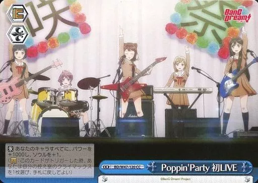 分類:クライマックス/レア度:CCシリーズ:ブースターパック BanG Dream!商品解説■Poppin’Partyのメンバー5人を中心に、アニメ登場キャラクターをカード化!ヴァイスシュヴァルツで「バンドリ!」をもっと楽しもう!!