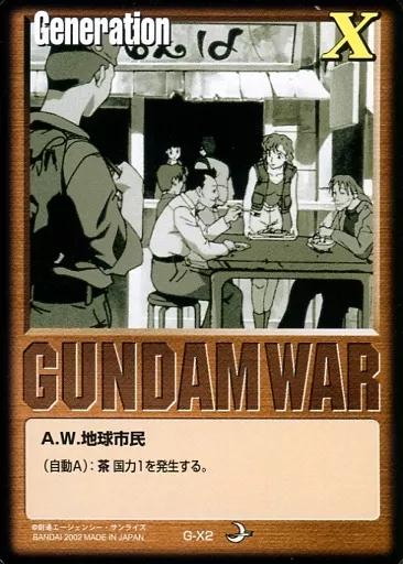 分類:茶/レア度:Cシリーズ:第8弾 月下の戦塵商品解説■すべてがリアルな機動戦士ガンダムTCG!登場MS、登場人物はもちろん、作戦名、戦法、コロニー落としの要素までガンダム戦史を忠実に再現!ガンダムファンであれば、ライトな方からヘビーな方まで十分楽しめる、全く新しい「ゲーム」の形、それが二人用の本格的な戦術級対戦TCG「ガンダムウォー」です!