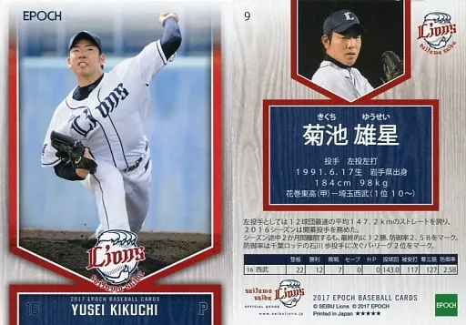 スポーツ/レギュラーカード/EPOCH ベースボールカード 2017 埼玉西武ライオンズ 9 [レギュラーカード] : 菊池雄星(振りかぶり)(全身)