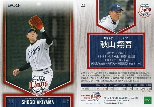 スポーツ/レギュラーカード/EPOCH ベースボールカード 2017 埼玉西武ライオンズ 22 [レギュラーカード] : 秋山翔吾(捕球)(膝上)