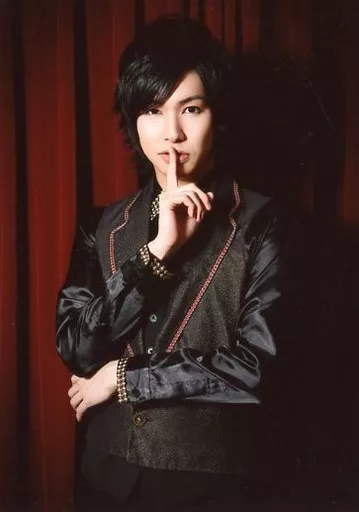 生写真(男性)/俳優 法月康平(Q)/膝上・衣装黒・右手人差し指立て・背景赤/舞台「CLUB SLAZY Another world」ブロマイドAセット