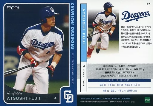 スポーツ/レギュラーカード/EPOCH ベースボールカード 2017 中日ドラゴンズ 27 [レギュラーカード] : 藤井淳志(★★)
