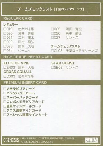 BBM/レギュラーカード/チームチェックリスト/千葉ロッテマリーンズ/BBM2017 ジェネシス CL03[レギュラーカード]:千葉ロッテマリーンズ
