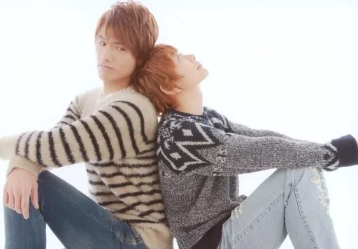 生写真(男性)/俳優 Kimeru・滝川英治/横型・膝上・座り・衣装白・黒・グレー・Kimeru顔上向き・滝川目線右・体左向き・背景白/「Kimeruと滝川英治の仲良しトークイベント」物販生写真