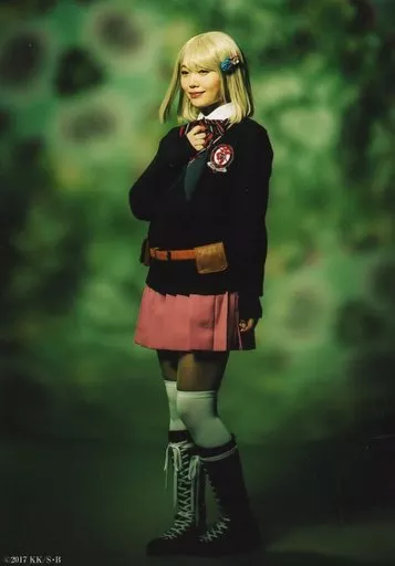 生写真(女性)/グラビアアイドル 松岡里英(杜山しえみ)/全身・衣装黒・左向き・右手胸元・背景緑・キャラクターショット/「舞台『青の祓魔師』島根イルミナティ篇」ブロマイド