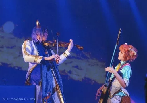 生写真(男性)/俳優 田中涼星(オリオン)・板垣李光人(セレン)/ライブフォト・横型・膝上・衣装白・紫・緑・両手楽器・向き合い・背景青・キャラクターショット/Live Musical「SHOW BY ROCK!!」~THE FES II-thousand XVII~ ステージブロマイドM