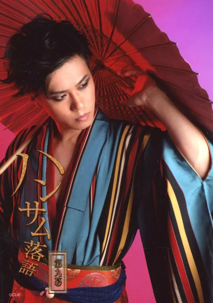 生写真(男性)/俳優 寺山武志/上半身・衣装青・顔右向き・番傘触り・背景ピンク/舞台「ハンサム落語 第九幕」ブロマイドB