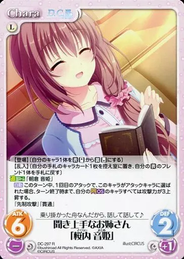 分類:Chara/レア度:Rシリーズ:ブースターパック OS:ダ・カーポ 3.00商品解説■■ChaosTCGとは?『ChaosTCG』とは、2人で対戦して遊ぶトレーディングカードゲームです。あなた自身がプレイヤーとなり、各作品のキャラクターの中から自分の大好きなキャラクターを自分のパートナーとして選び、パートナーと協力し合いながら、アリーナと呼ばれる舞台で対戦相手とゲームの勝敗を競います。