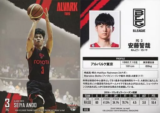 BBM/レギュラーカード/アルバルク東京/BBM2018 BBM×B.LEAGUE TRADING CARDS 2017-18 SEASON FAST BREAK 1st Half 013 [レギュラーカード] : 安藤誓哉