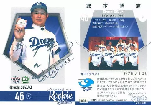 BBM/レギュラーカード/中日ドラゴンズ/BBM2018 ルーキーエディション 099[レギュラーカード]:鈴木博志(正面)(銀箔押しサイン入り)(/100)