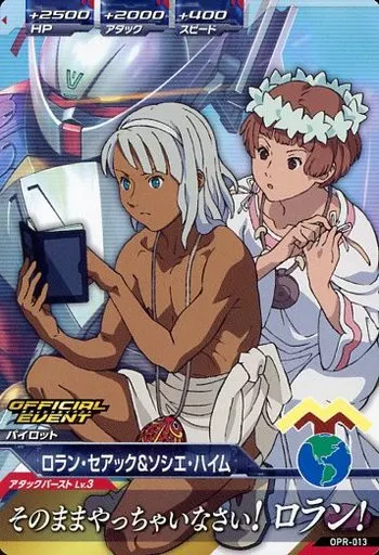 分類:パイロット/レア度:PRシリーズ:「NEWスペシャルカードパック03」商品解説■ガンダムトライエイジとはモビルスーツカード3枚、パイロットカード3枚の計6枚のカードで3機編成の小隊を組んで戦う進化系ガンダムカードバトルだ!