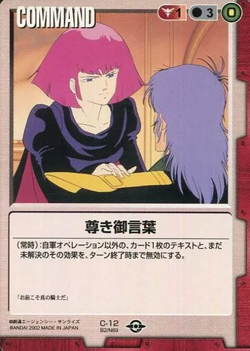 分類:赤/レア度:Cシリーズ:ベースドブースター 第2弾商品解説■すべてがリアルな機動戦士ガンダムTCG!登場MS、登場人物はもちろん、作戦名、戦法、コロニー落としの要素までガンダム戦史を忠実に再現!ガンダムファンであれば、ライトな方からヘビーな方まで十分楽しめる、全く新しい「ゲーム」の形、それが二人用の本格的な戦術級対戦TCG「ガンダムウォー」です!