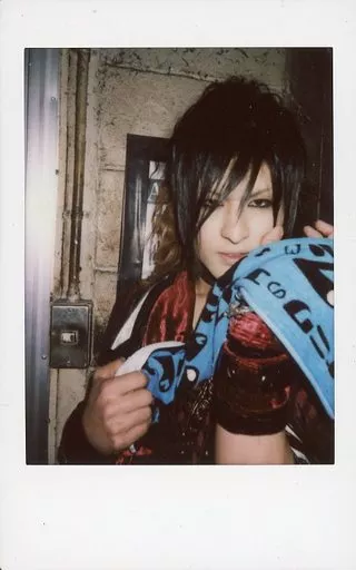 生写真(男性)/ヴィジュアル系バンド/A&D A&D/IRU/バストアップ・衣装赤・黒・両手タオル・左手上げ・背景グレー/生チェキ