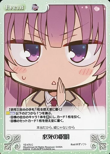 分類:Event/レア度:Cシリーズ:ブースターパック RIDDLE JOKER商品解説■■ChaosTCGとは?『ChaosTCG』とは、2人で対戦して遊ぶトレーディングカードゲームです。あなた自身がプレイヤーとなり、各作品のキャラクターの中から自分の大好きなキャラクターを自分のパートナーとして選び、パートナーと協力し合いながら、アリーナと呼ばれる舞台で対戦相手とゲームの勝敗を競います。