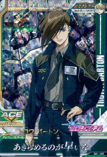 分類:パイロット/レア度:Mシリーズ:OPERATION ACE 2弾商品解説■ガンダムトライエイジとはモビルスーツカード3枚、パイロットカード3枚の計6枚のカードで3機編成の小隊を組んで戦う進化系ガンダムカードバトルだ!