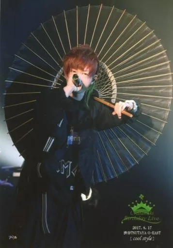 生写真(男性)/歌い手 うらたぬき/ライブフォト・膝上・衣装黒・右手マイク口元・左手傘・「2017.8.17 渋谷TSUTAYA O-EAST cool style」/「Uratanuki Birthday Live cute style & cool style」メモカぴあ