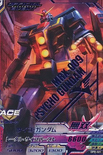 分類:モビルスーツ/レア度:PRシリーズ:「NEWスペシャルカードパック04」商品解説■ガンダムトライエイジとはモビルスーツカード3枚、パイロットカード3枚の計6枚のカードで3機編成の小隊を組んで戦う進化系ガンダムカードバトルだ!