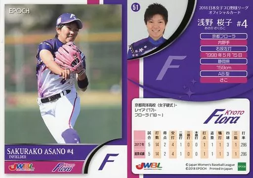 スポーツ/レギュラーカード/京都フローラ/2018 日本女子プロ野球リーグ オフィシャルカード 51 [レギュラーカード] : 浅野桜子