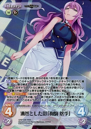 分類:Chara/レア度:RRRシリーズ:ブースターパック グリザイア:ファントムトリガー商品解説■■ChaosTCGとは?『ChaosTCG』とは、2人で対戦して遊ぶトレーディングカードゲームです。あなた自身がプレイヤーとなり、各作品のキャラクターの中から自分の大好きなキャラクターを自分のパートナーとして選び、パートナーと協力し合いながら、アリーナと呼ばれる舞台で対戦相手とゲームの勝敗を競います。