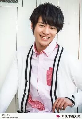 生写真(男性)/俳優 D2/阿久津愼太郎/膝上・衣装白・ピンクシャツ・左手見せ・顔傾げ・笑顔・背景白・「2013.05」/公式生写真