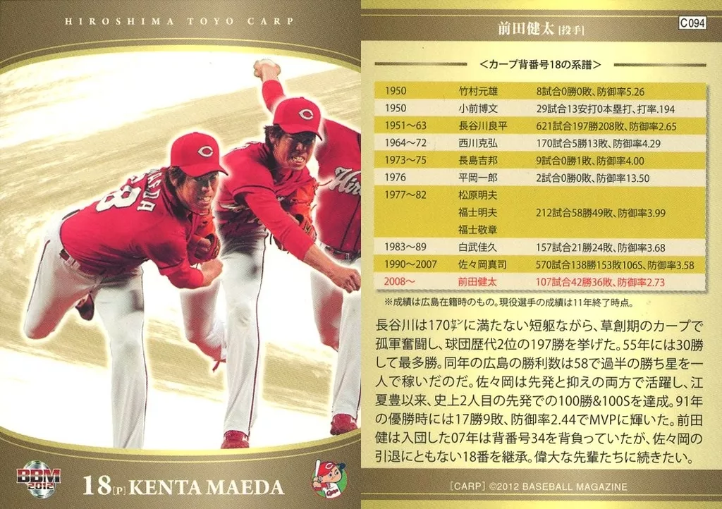 BBM/レギュラーカード/パズルカード/BBM2012 広島東洋カープ C094 [レギュラーカード] : 前田健太