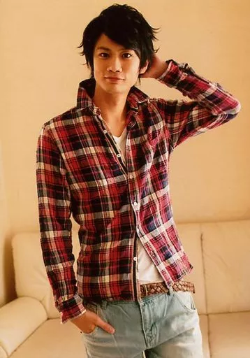 生写真(男性)/俳優 馬場良馬/膝上・シャツ赤チェック柄・右手ポケット・左手頭・背景ベージュ/「2013年 馬会vol.1」ブロマイド