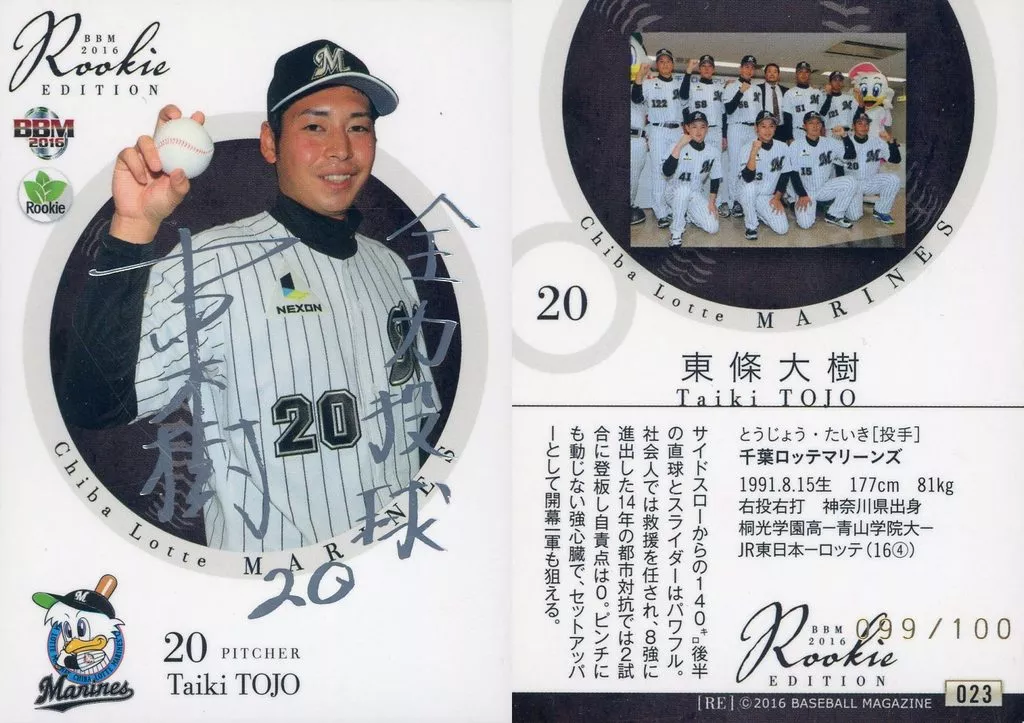 BBM/レギュラーカード/千葉ロッテマリーンズ/BBM2016 ルーキーエディション 023[レギュラーカード]:東條大樹(銀箔押しサイン入り)(/100)