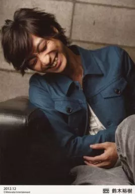 生写真(男性)/俳優 D-BOYS/鈴木裕樹/膝上・座り・衣装緑青・両手お腹・笑顔・目閉じ/2012.12/公式生写真