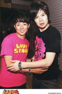生写真(男性)/お笑いタレント 吉本興業/吉村崇・綾部祐二/上半身・衣装黒ピンク・向かい合い・背景シャッター/ポストカードサイズ/LIVE STAND2010/公式生写真