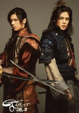 生写真(男性)/俳優 中村誠治郎・入野自由/膝上・衣装赤・青・グレー・刀・背景グレー/舞台「ガーネット オペラ」ブロマイド