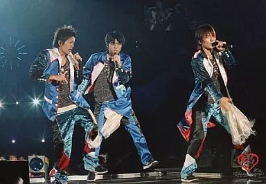 生写真(ジャニーズ)/アイドル/V6 V6/森田剛・井ノ原快彦・長野博/横型・ライブフォト・全身・衣装水色灰色白・左手マイク・枠無し・背景黒/10th Anniversary