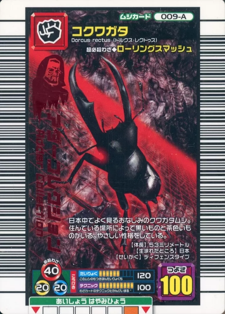 分類:ムシカード/レア度:キラ赤シリーズ:2006 ファースト商品解説■甲虫王者ムシキングはキミの町のショッピングセンター・ゲームセンターにおいてある甲虫バトルゲームだ!!カードを使って世界中の甲虫による大はく力のムシバトルが楽しめるぞ!