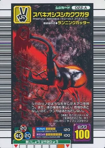 分類:ムシカード/レア度:キラ赤シリーズ:2006 ファースト商品解説■甲虫王者ムシキングはキミの町のショッピングセンター・ゲームセンターにおいてある甲虫バトルゲームだ!!カードを使って世界中の甲虫による大はく力のムシバトルが楽しめるぞ!