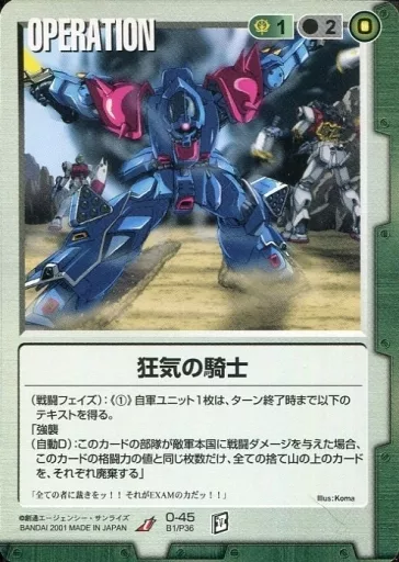 分類:緑/レア度:Uシリーズ:ベースドブースター 第1弾商品解説■すべてがリアルな機動戦士ガンダムTCG!登場MS、登場人物はもちろん、作戦名、戦法、コロニー落としの要素までガンダム戦史を忠実に再現!ガンダムファンであれば、ライトな方からヘビーな方まで十分楽しめる、全く新しい「ゲーム」の形、それが二人用の本格的な戦術級対戦TCG「ガンダムウォー」です!