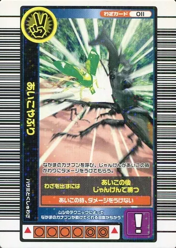 分類:わざカードシリーズ:2004 夏限定商品解説■甲虫王者ムシキングはキミの町のショッピングセンター・ゲームセンターにおいてある甲虫バトルゲームだ!!カードを使って世界中の甲虫による大はく力のムシバトルが楽しめるぞ!