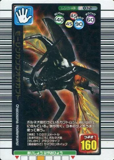 分類:ムシカード/レア度:銅シリーズ:2005 夏限定商品解説■甲虫王者ムシキングはキミの町のショッピングセンター・ゲームセンターにおいてある甲虫バトルゲームだ!!カードを使って世界中の甲虫による大はく力のムシバトルが楽しめるぞ!