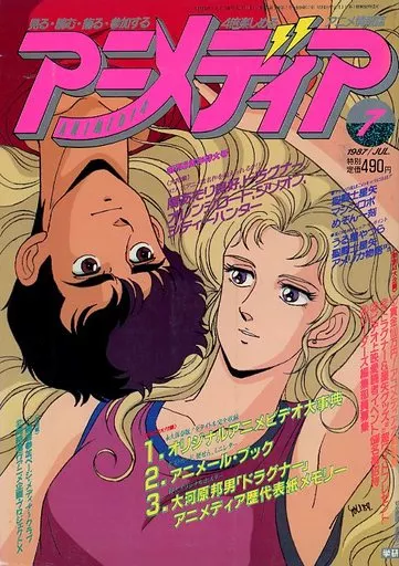 別冊付録:1)オリジナルアニメ大事典、2)アニメール・ブック、3)大河原邦男「ドラグナー」アニメディア歴代表紙メモリー 特大オリジナルポスター/綴込付録:1)シール、2)カセットレーベル、3)カレンダー/陽あたり良好・ドラグナー・オレンジロード・ジリオン・シティーハンター/テレビの夏はこのキャラに注目!! 聖闘士星矢/マシンロボ/めぞん一刻/夏の映画チェック・ザ・ポイント うる星やつら/聖闘士星矢/アメリカ物語