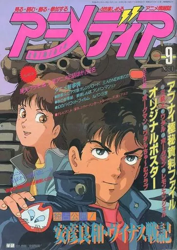 別冊付録:1)アブナイアニメ極秘資料ファイル(三銃士/ワタル/ボーグマン/レモンエンジェル)、2)オリジナルポスター(ボーグマン/ワタリちゃ~むクラブ)/綴込付録:安彦良和キャラスペシャルシール/人気アニメ3人組カセットレーベル/ピンナップ(表紙・トルーパー・後藤隆幸)/独占公開!?安彦良和・ヴイナス戦記/アニメ新事情?●映画&ビデオ版オレンジロード/三人のNEWまどか?●秋の新番組/美味しんぼ、アンパンマン?ほか?●幻のパイロット?フィルム ?ルパン三世/TVアニメ?星矢、シティーハンター、トルーパー、F、味っ子?ほか/劇場版・聖闘士星矢名場面レビュー