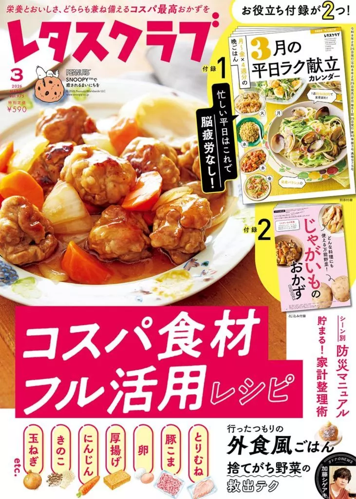 別冊付録:3月の平日ラク献立カレンダー/綴込付録:じゃがいものおかずBOOK/特集:表紙:コスパ食材フル活用おかず